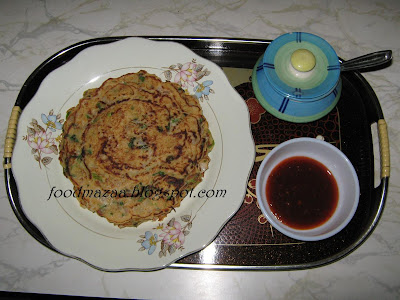 3. Heat a griddle, spread the batter carefully to make a pancake about 1.2 cm thick. Bake two sides using oil until the pancake is cooked well.
